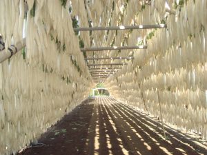 収穫後、やぐら干しされた大根の光景は